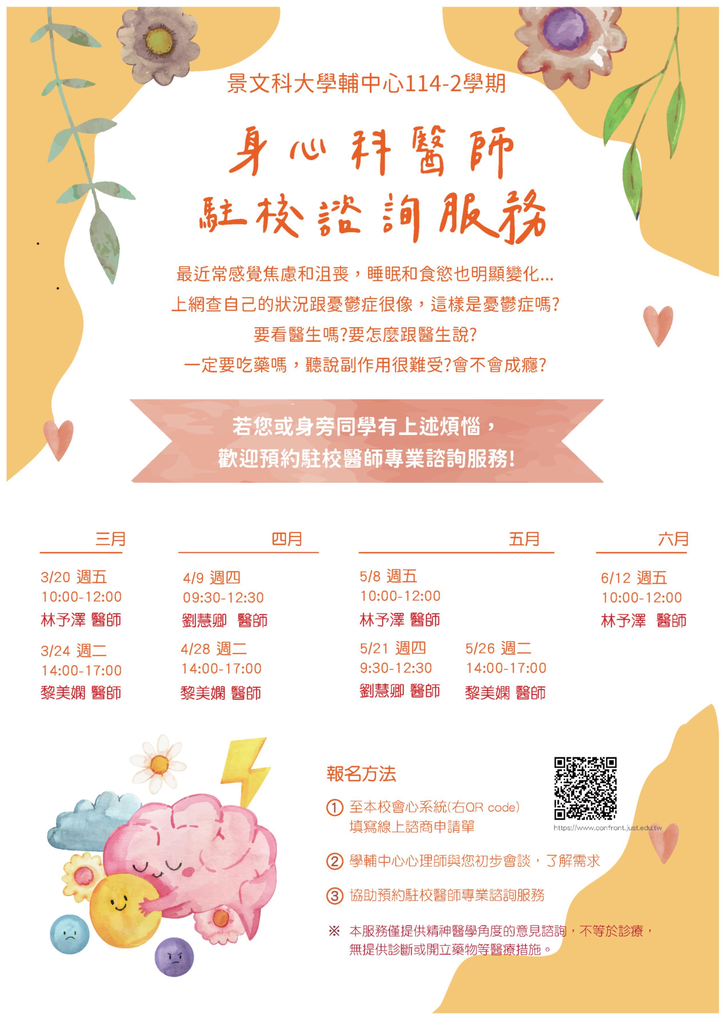 【學輔活動】114-2 身心科醫師駐校諮詢服務來囉!歡迎同學利用此項服務。◕‿◕。