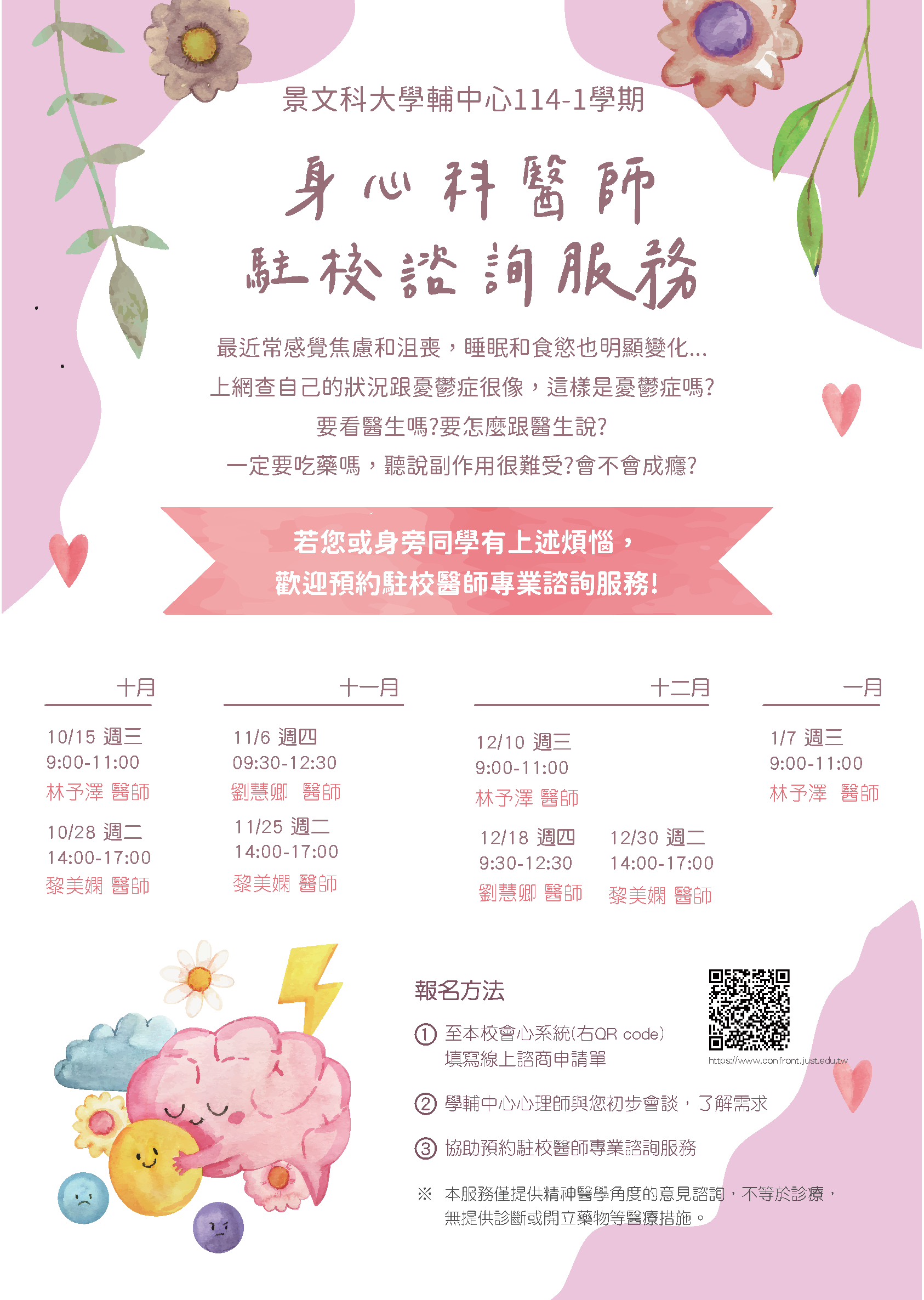 114-1 身心科醫師駐校諮詢服務來了!!! 歡迎同學利用此項服務。◕‿◕。