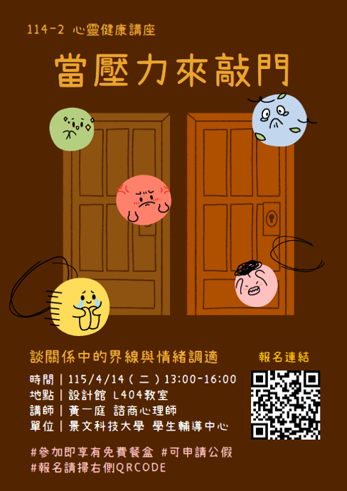 各位同學們好 👋 結束寒假、剛回到校園的你,最近還好嗎? 學輔中心將於 4 月中舉辦心靈健康講座,邀請到幽默又溫暖的 黃一庭 諮商心理師,陪大家聊聊大學生常見的煩惱,以及如何在壓力中找回自己。 🌧 你是不是也常常—— 壓力不是敵人,它其實在傳遞訊息。 透過這場講座,陪你一起—— 📌 活動資訊 ✨ 名額有限,額滿為止 📢 歡迎有興趣的同學踴躍報名參加!