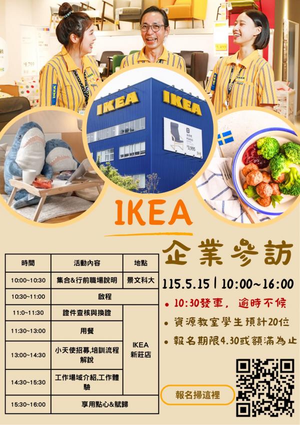 114-2學期資源教室的企業參訪來囉~ 這次要去的是身障友善企業IKEA宜家家居新莊店!!! 想了解大企業身障員工聘僱、培訓流程和工作內容,快來參加! 🛋️參訪日期:115年5月15日(五) 🛋️參訪時間:10:00-16:00 🛋️招募對象:資源教室學生,限20人
